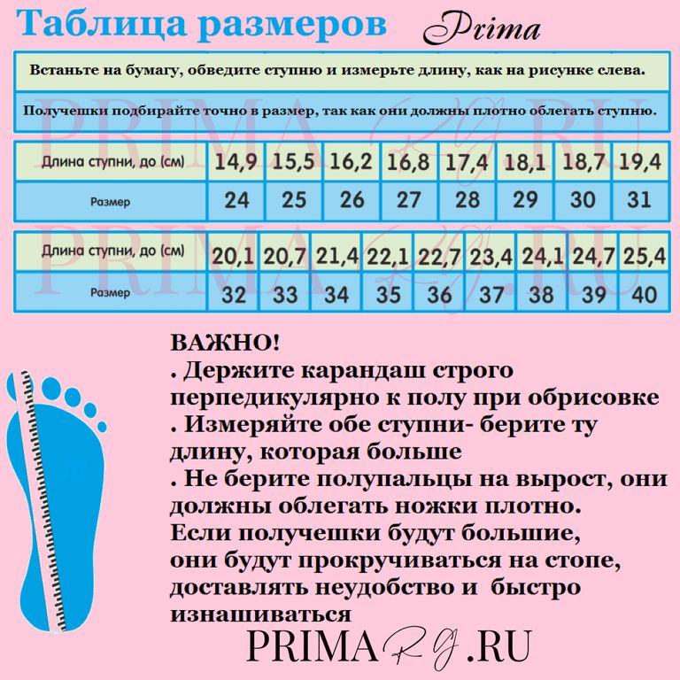Обратите внимание, профессиональные получешки должны сидеть плотно на стопах, в обтяжку, поэтому размер нужно выбирать по нижней границе.