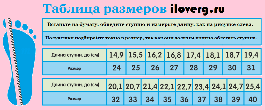 Для определения подходящего размера получешек воспользуйтесь размерной таблицей